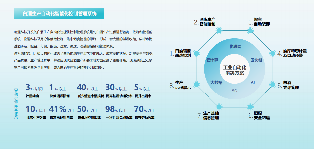物通科技借助自身優(yōu)勢(shì),借助與企業(yè)、高校多年深度合作過(guò)程中積累的豐富管理經(jīng)驗(yàn),在傳承白酒傳統(tǒng)生產(chǎn)工藝的基礎(chǔ)上,攻克了白酒生產(chǎn)過(guò)程及基酒質(zhì)量控制方面的技術(shù)難題,成功研發(fā)了白酒生產(chǎn)自動(dòng)控制及信息管理系統(tǒng),改變了傳統(tǒng)酒類庫(kù)房操作和管理模式,實(shí)現(xiàn)了用電子信息技術(shù)提升傳統(tǒng)白酒行業(yè)酒源管理和質(zhì)量的目的,推進(jìn)了釀酒科技成果產(chǎn)業(yè)化程,對(duì)打造名酒品牌作出新貢獻(xiàn)。