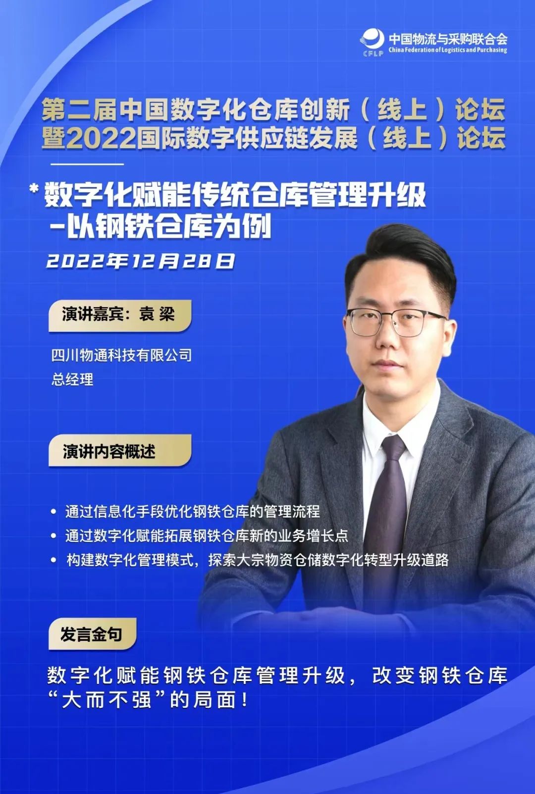 2022年12月28日,由中國物流與采購聯(lián)合會(huì)(下稱“中物聯(lián)”)主辦,中物聯(lián)物聯(lián)網(wǎng)技術(shù)與應(yīng)用專業(yè)委員會(huì)、中物聯(lián)物流企業(yè)評(píng)估辦公室與中物聯(lián)國際合作部聯(lián)合承辦的「第二屆中國數(shù)字化倉庫創(chuàng)新論壇暨2022國際數(shù)字供應(yīng)鏈發(fā)展論壇」于線上盛大召開。四川物通科技集團(tuán)有限公司總經(jīng)理袁梁作為嘉賓受邀參會(huì)并在論壇中發(fā)表主題演講。