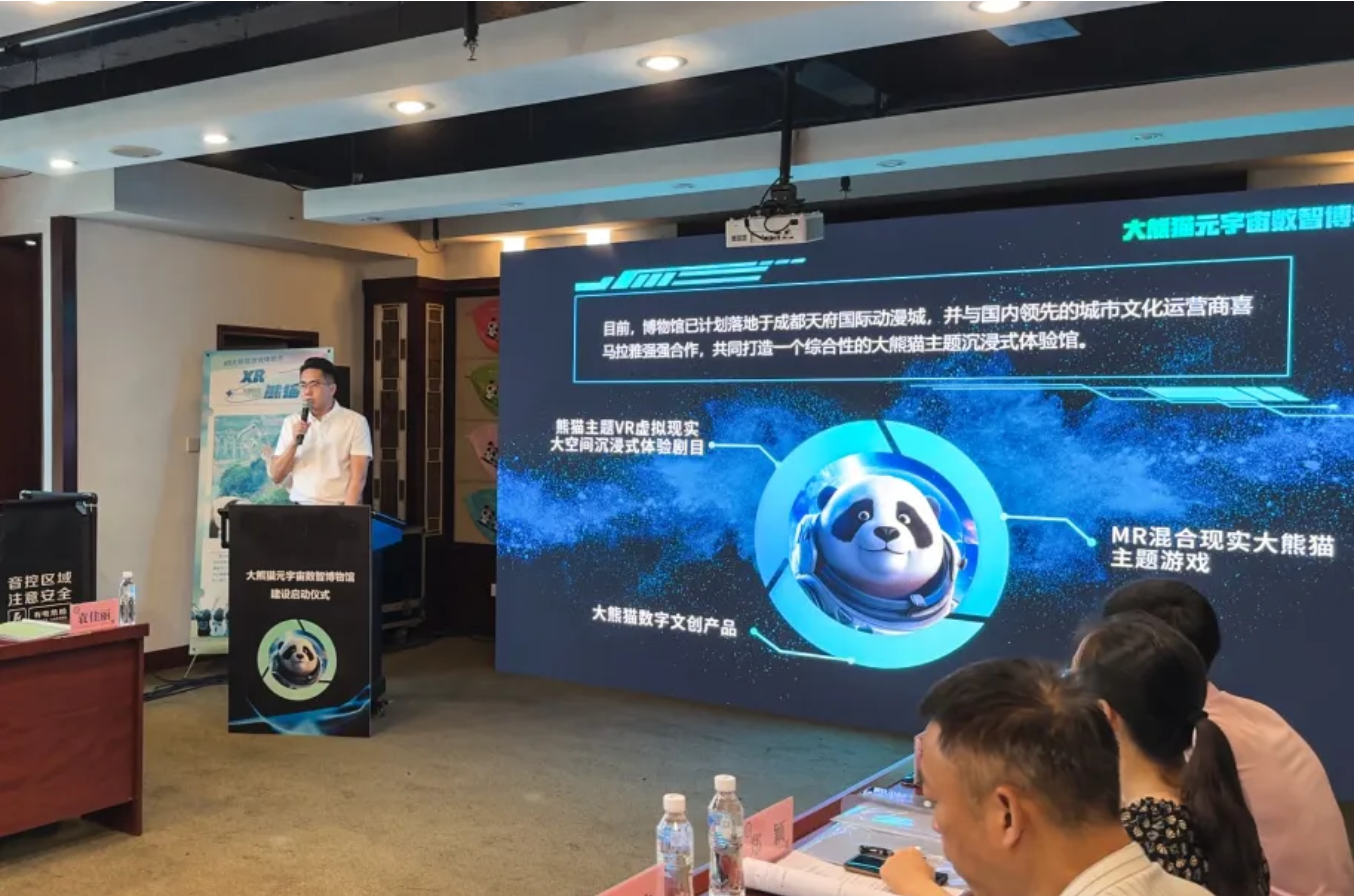 在首批體驗(yàn)官授予儀式中,袁梁宣布在場(chǎng)的所有來賓成為大熊貓?jiān)钪鏀?shù)智博物館的首批體驗(yàn)官,并將享受一系列專屬福利。他還談及,下一階段,線下大熊貓?jiān)钪鏀?shù)智博物館將落地成都天府國(guó)際動(dòng)漫城,打造一個(gè)綜合性的大熊貓主題沉浸式體驗(yàn)館。館內(nèi)將呈現(xiàn)多款熊貓主題的VR虛擬現(xiàn)實(shí)大空間沉浸式體驗(yàn)劇目、MR混合現(xiàn)實(shí)大熊貓主題游戲,以及獨(dú)家授權(quán)的大熊貓數(shù)字文創(chuàng)產(chǎn)品。