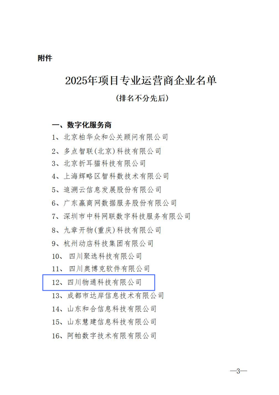 為貫徹落實(shí)商務(wù)部等七部門聯(lián)合印發(fā)的《零售業(yè)創(chuàng)新提升工程實(shí)施方案》精神,推動(dòng)零售業(yè)高質(zhì)量發(fā)展、提升全國(guó)商業(yè)運(yùn)營(yíng)服務(wù)能力,中國(guó)商業(yè)聯(lián)合會(huì)于2025年組織開展了項(xiàng)目專業(yè)運(yùn)營(yíng)商企業(yè)遴選工作。經(jīng)企業(yè)自主申報(bào)、材料初審、專家審核及網(wǎng)上公示等程序,四川物通科技集團(tuán)有限公司成功入選“數(shù)字化服務(wù)商”類企業(yè),成為全國(guó)50家上榜單位之一。