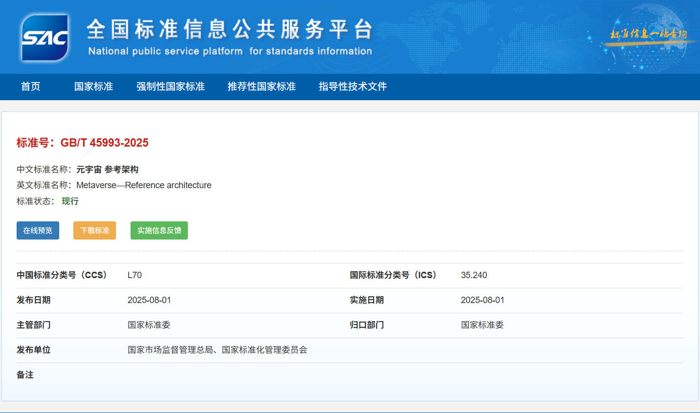 近日,由工業(yè)和信息化部指導,全國信息技術標準化技術委員會發(fā)布的國家標準《元宇宙 參考架構》(GB/T 45993-2025)正式公布實施。